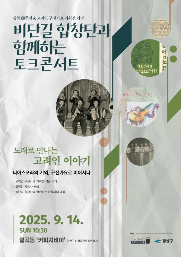 월곡고려인문화관은 광복 80주년 및 고려인 구전가요 기획전을 기념하여, 오는 9월 14일 <비단길 합창단과 함께하는 토크콘서트> 를 진행합니다.